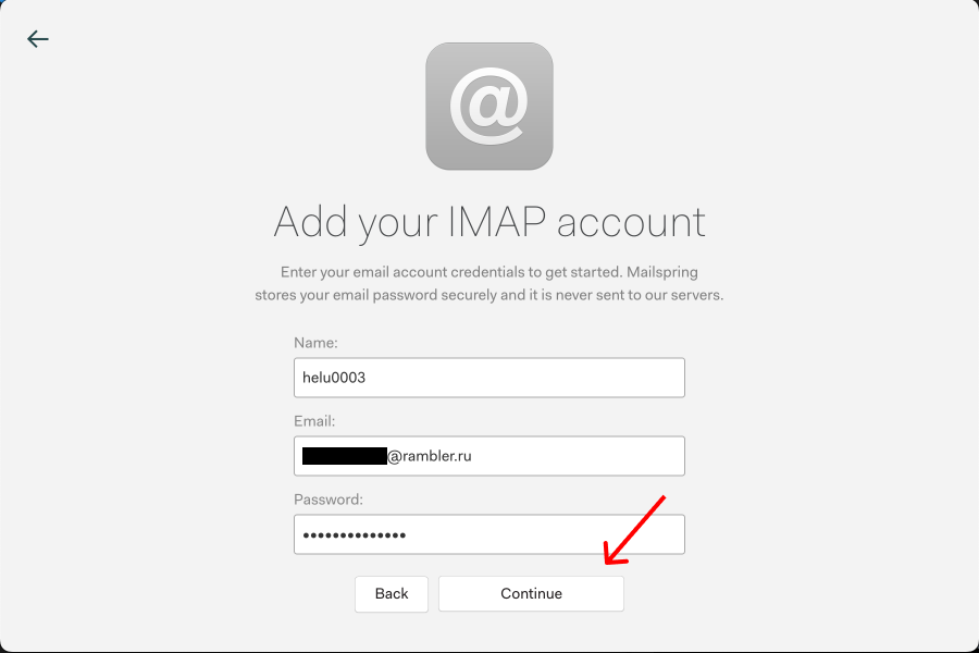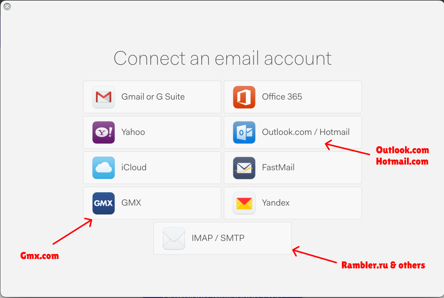 **#2** Check on your order which domains emails you've got. (###@rambler.ru, ###@outlook.com, ###@gmx.com) Select the right IMAP gateaway based on your domain. For Rambler.ru press 'IMAP/SMTP'. <br>